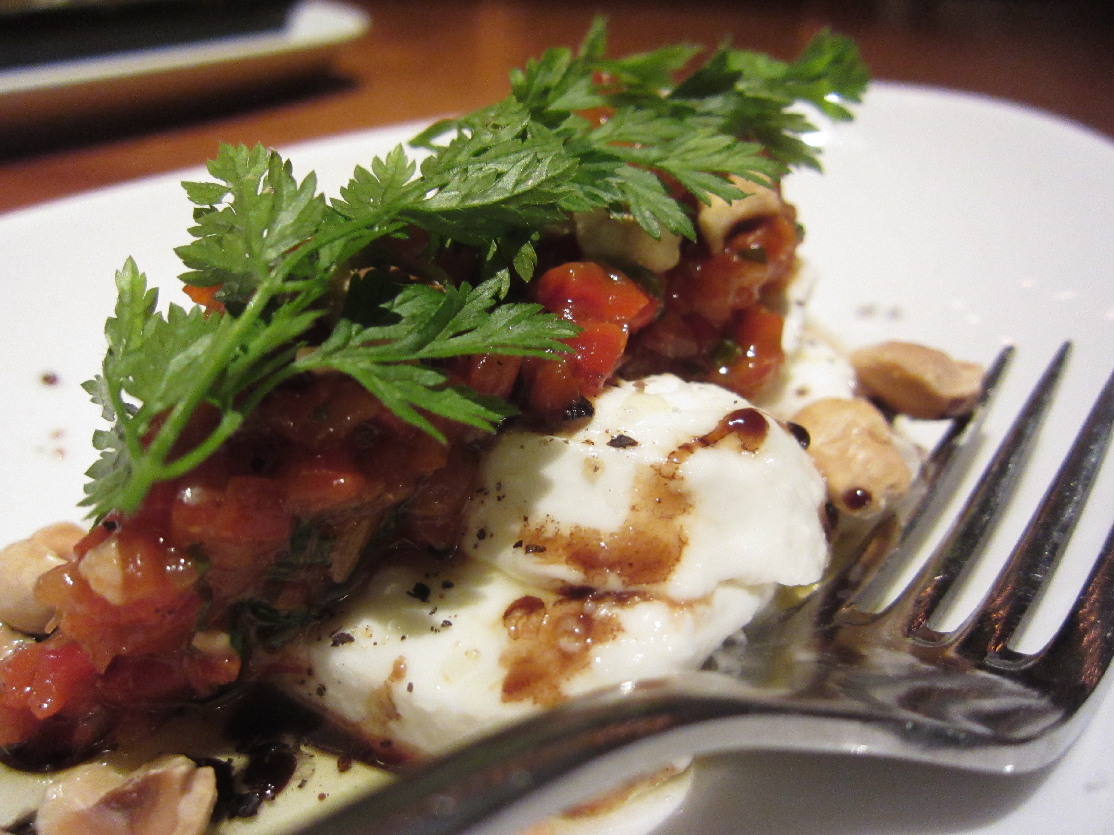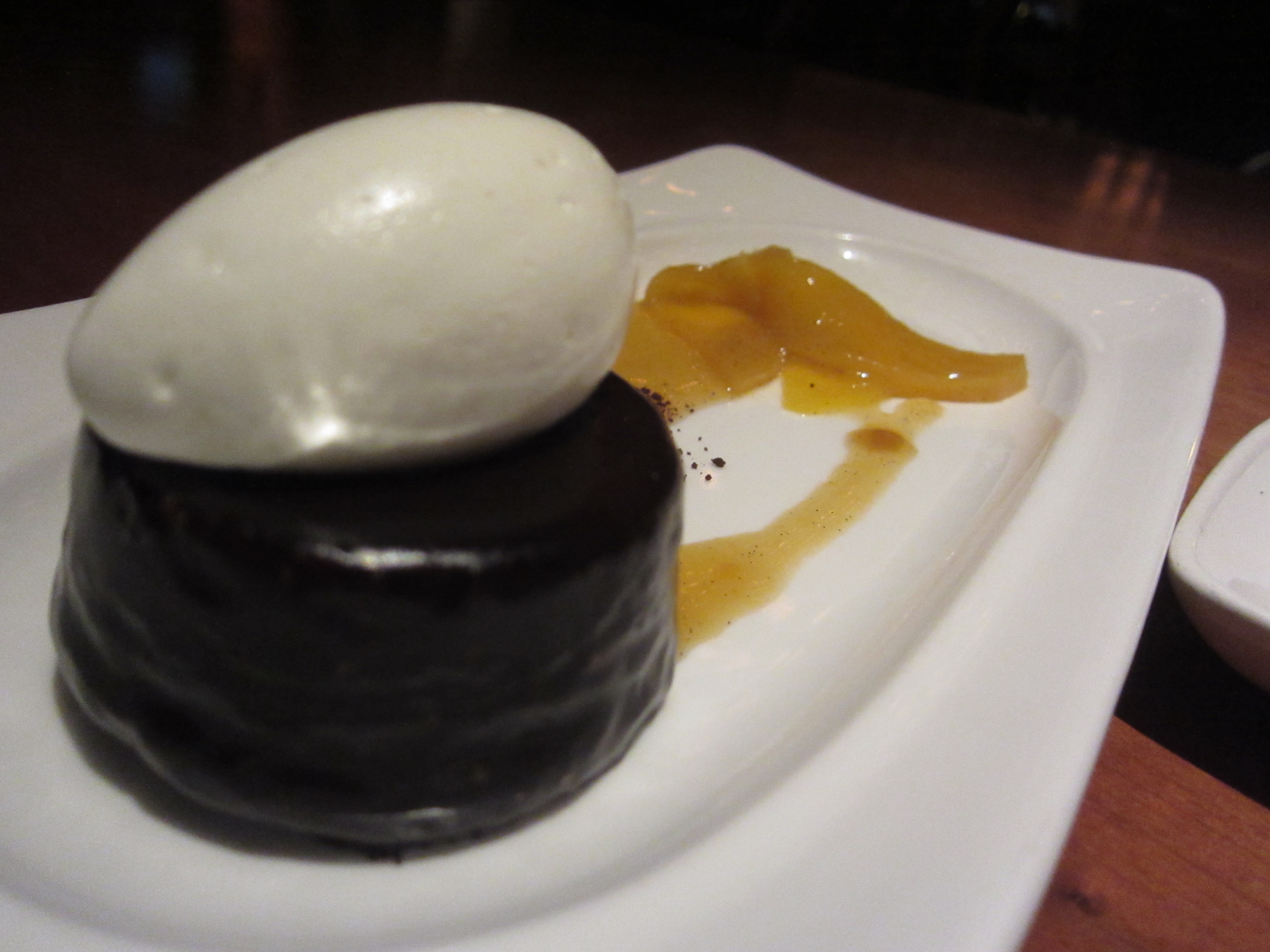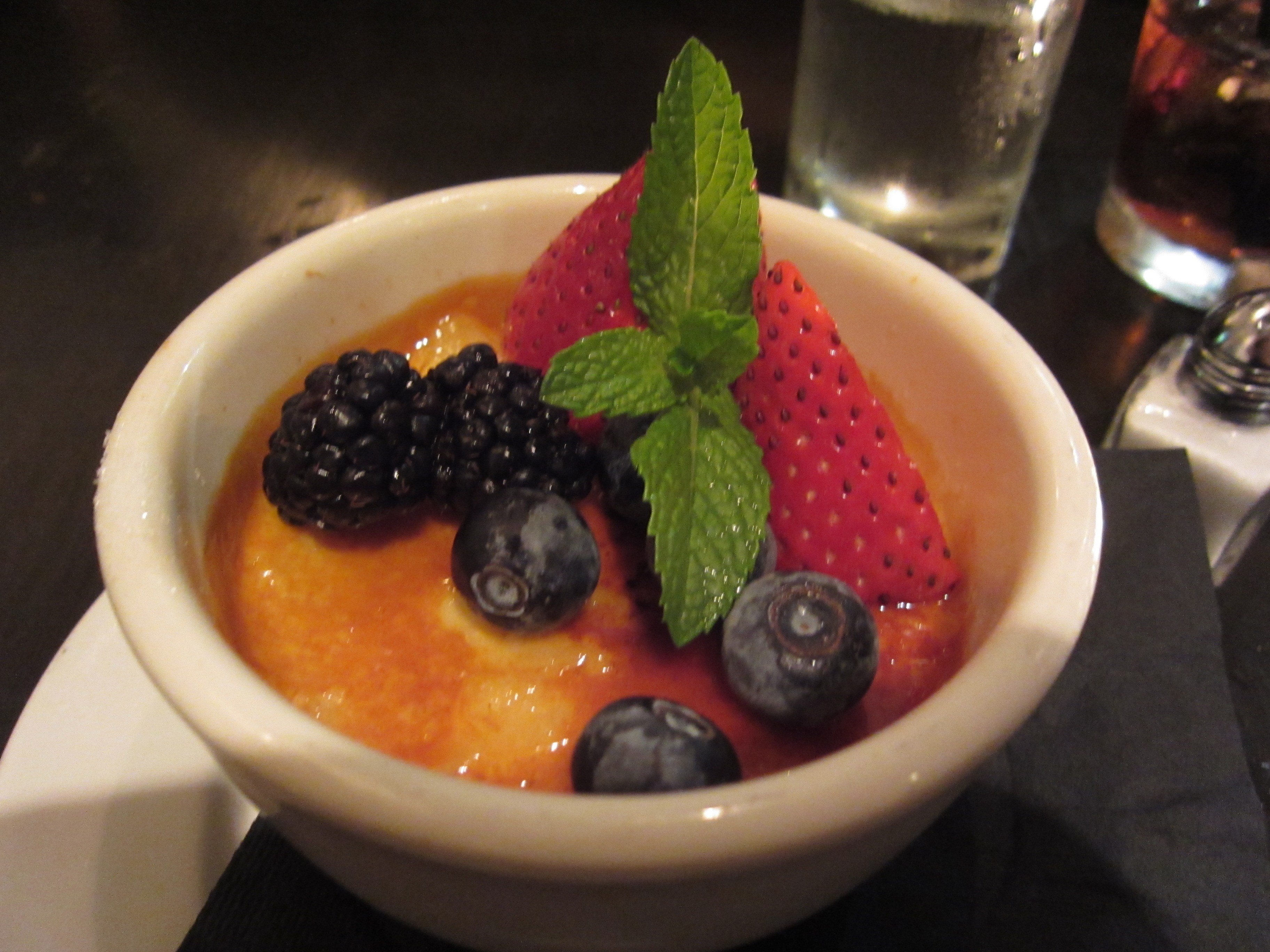 We ended things with the creme brulee. Is it weird that I am writing this while enjoying a Caramel Brulee Frap at Starbucks? The creme brulee was a great finish of a tasty dinner. The fresh fruit on top was a nice touch — it kind of makes this cream on sugar on fat dessert more of a healthy dessert. It was custardy and sweet with a nice crunch of the brulee.