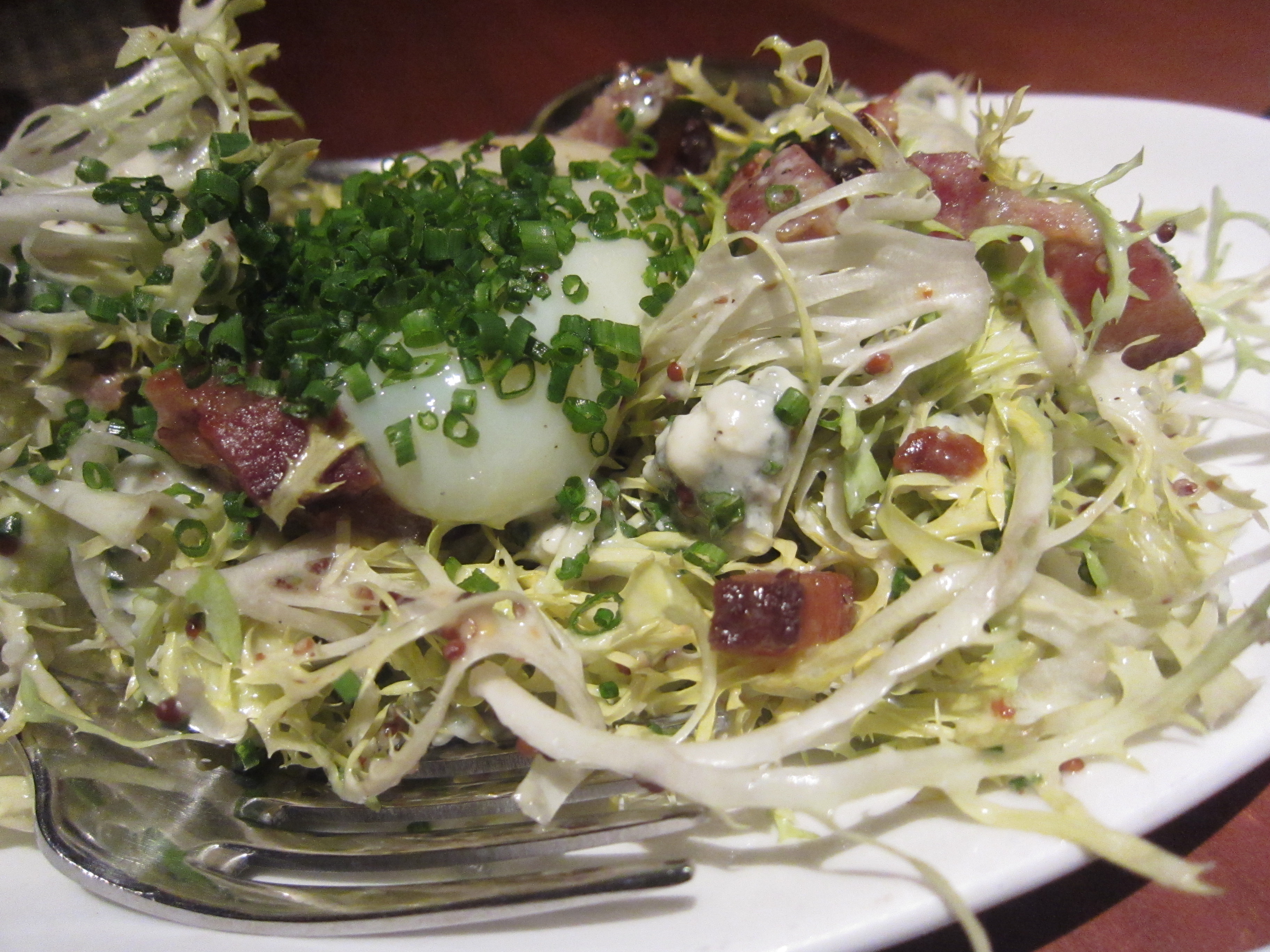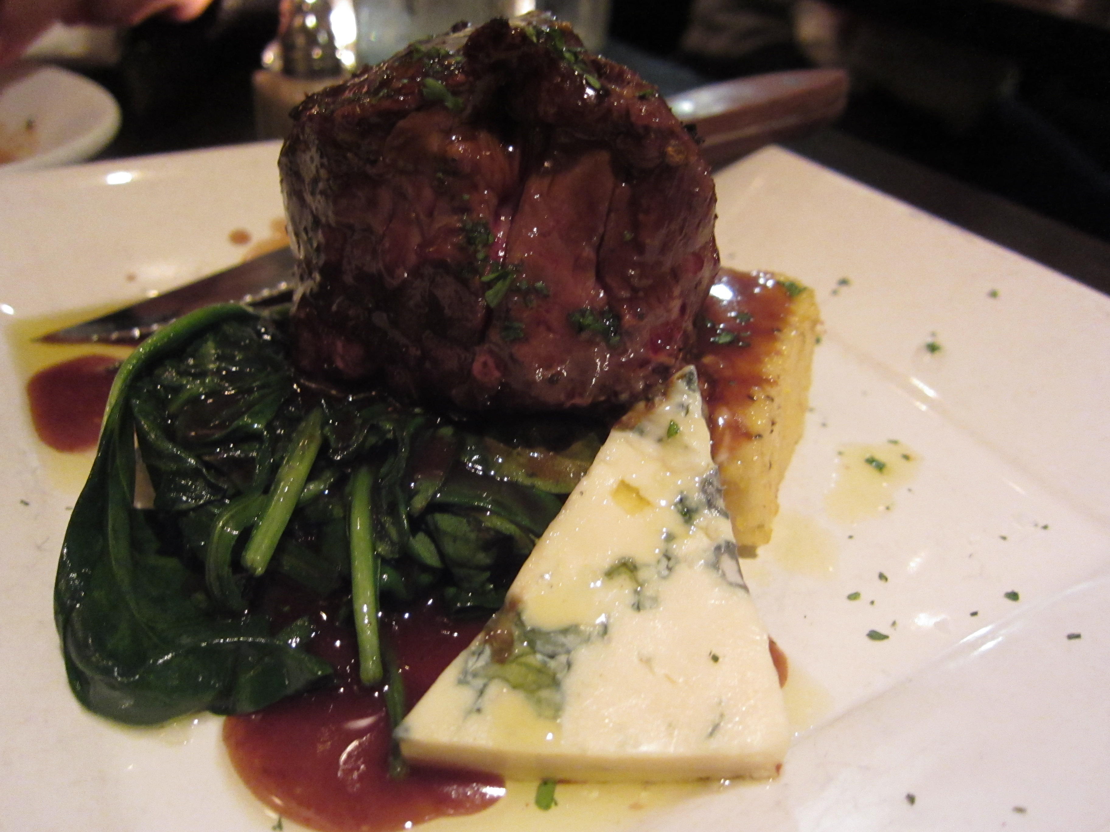 When I saw filet minon for 10 bucks, I was shocked. It must taste like crap, and it must be small is what I thought to myself. I was totally wrong. Well, half wrong. It didn’t taste like crap, but it was small, as expected. The side of organic polenta was a delight and the side spinach made sure I had my greens for the day. The large wedge of blue cheese made for a creamy, pungent “sauce” for the filet. The filet was cooked perfectly and was butter soft. All this for 10 bucks? I should have ordered 2!