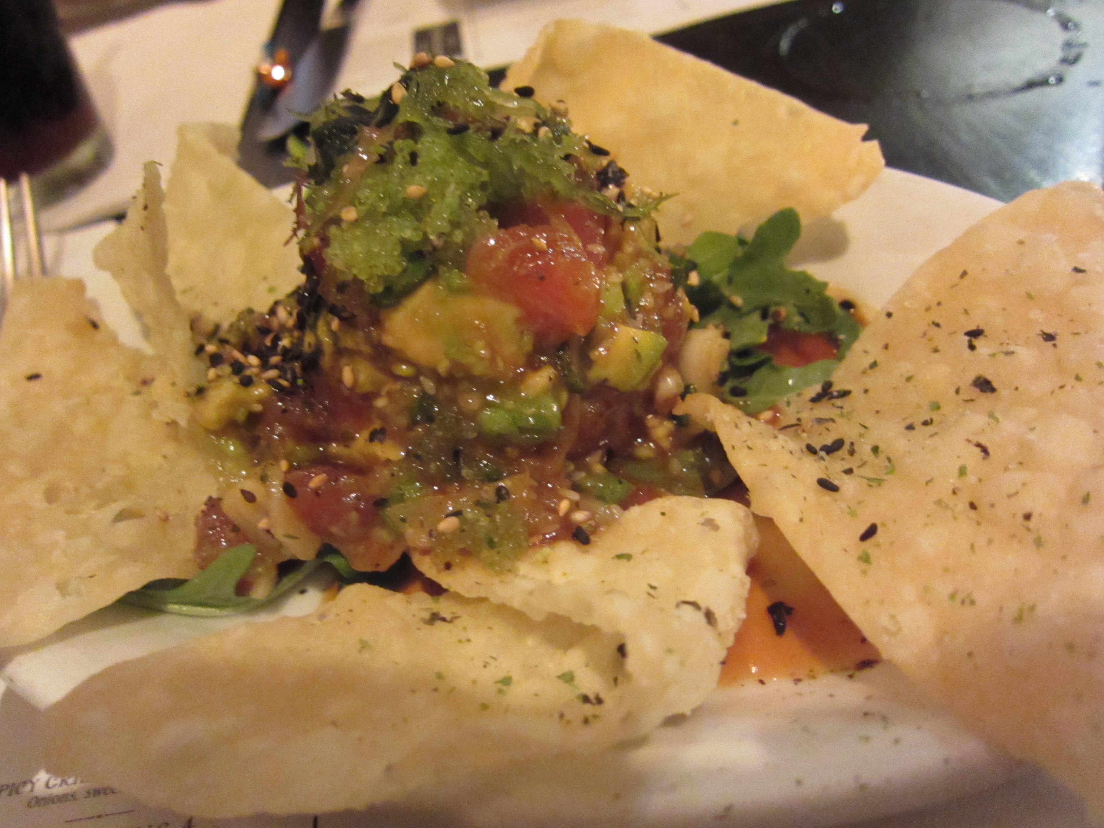 We started off with the wild hawaiian ahi poke. A mixture of onion, seaweed, avocado, spicy soy, and ahi tuna was a fresh dip for the fried wonton chips. Though the wonton chips were greasy, the dip was bearable. The avocados were creamy and the acidity of the ingredients helped with the greasy chips. The ingredients melded well together, but the fish could have been fresher. But stating these things would be nitpicking. This was a great start to our dinner at K’ya Bistro.