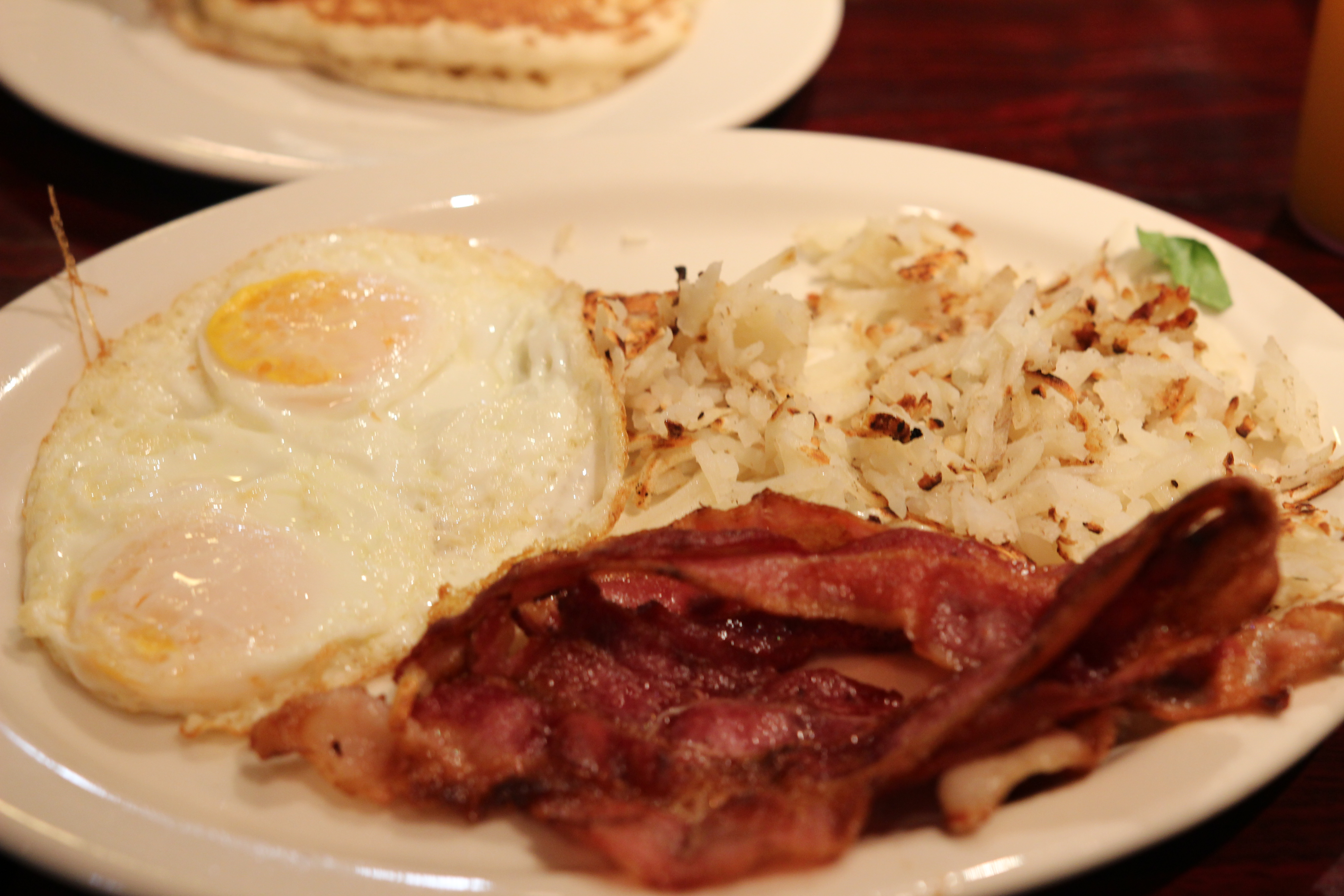 My eggs were cooked nicely, and the bacon was a good match. Bacon and eggs is always a sure thing — only of the hash browns were good. No crisp, no buttered bits of goodness — they were just kind of there on the plate. Masked in ketchup and hot sauce, I made the most of it.