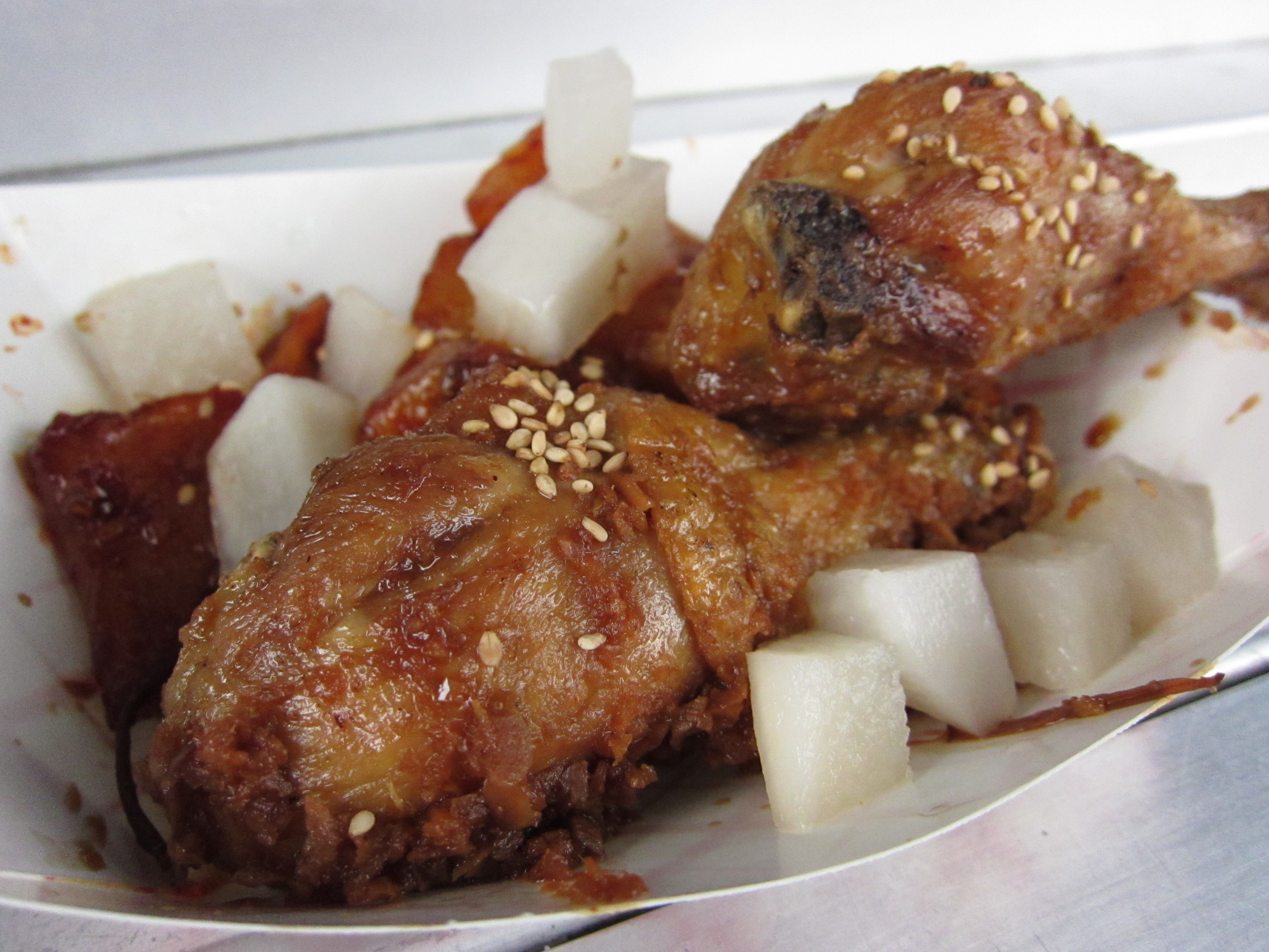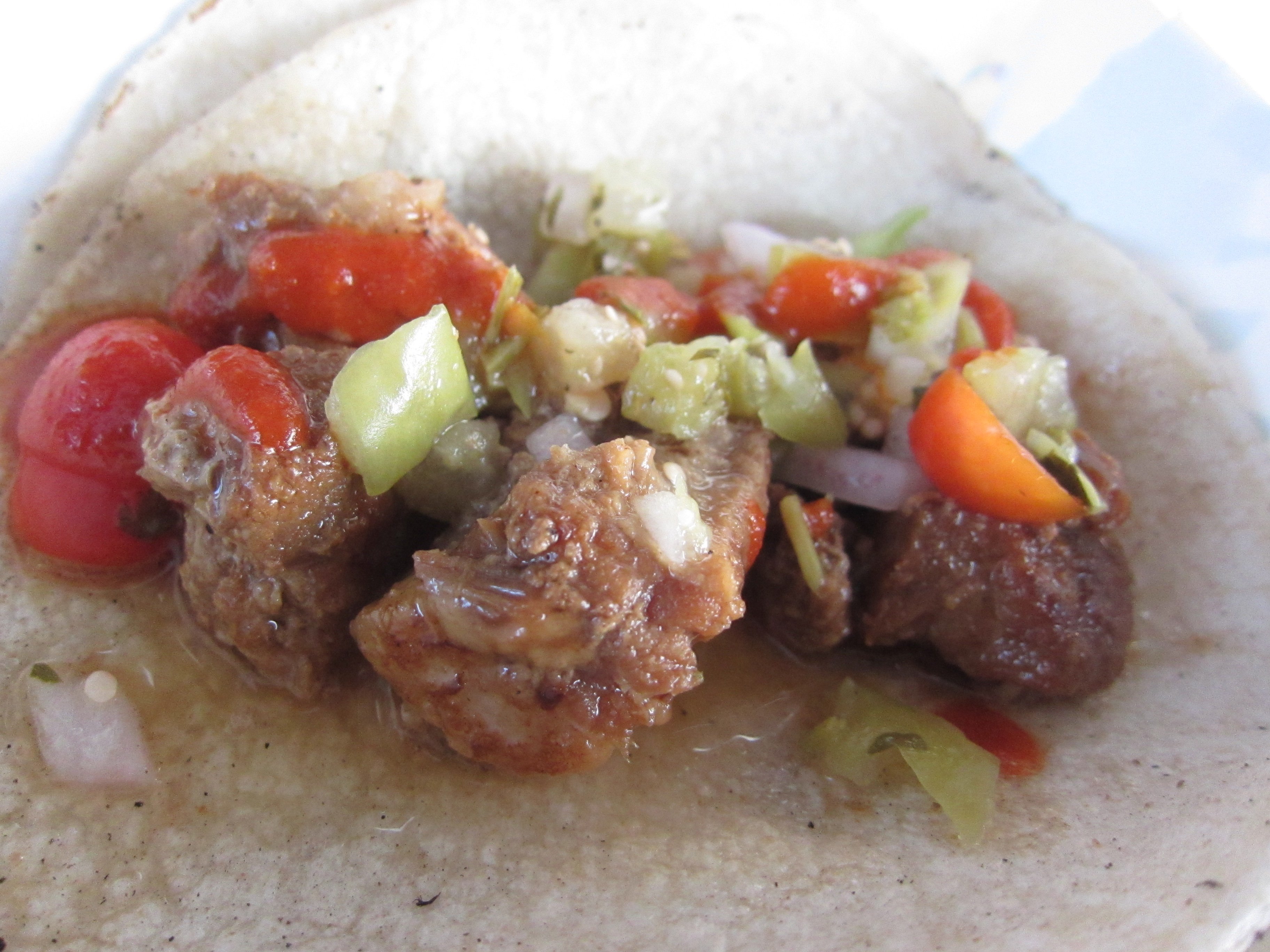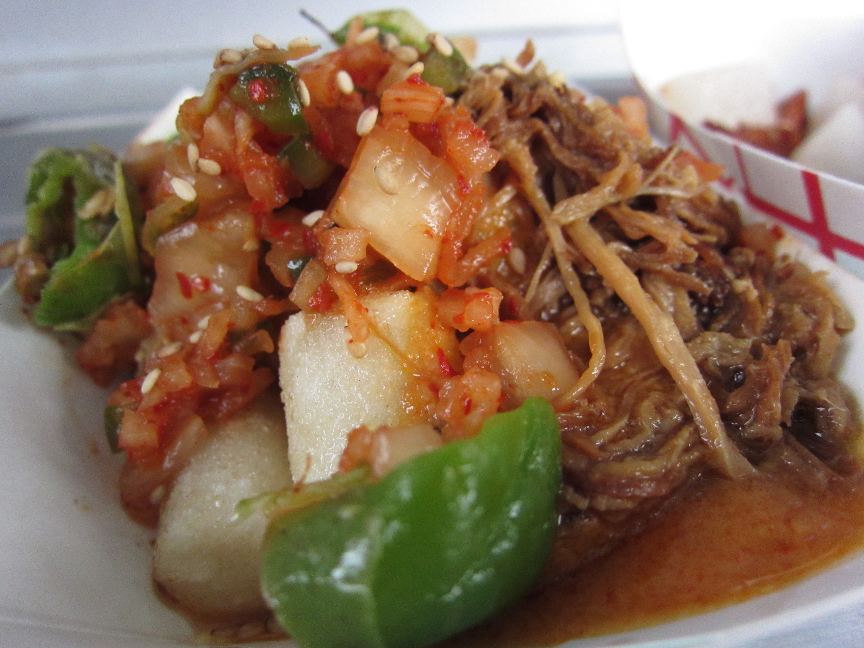 There comes a time when you get greedy and order something you regret. The adobo tacos were just that — money well spent. The adobo style pork belly was nearly dry — I was thinking pork belly, fatty, tender, and fatty. The pork in these tacos were lacking in quality and quantity. The green tomatillo, pico de gallo, and sriracha on top was tasty, atleast. The taco as a whole didn’t work for me. The tortilla was kind of cold, the protein a little off — it just didn’t do it for me, especially for 3 bucks. If you are a food truck, doing tacos right is a must. I mean, food trucks were born from this stuff.