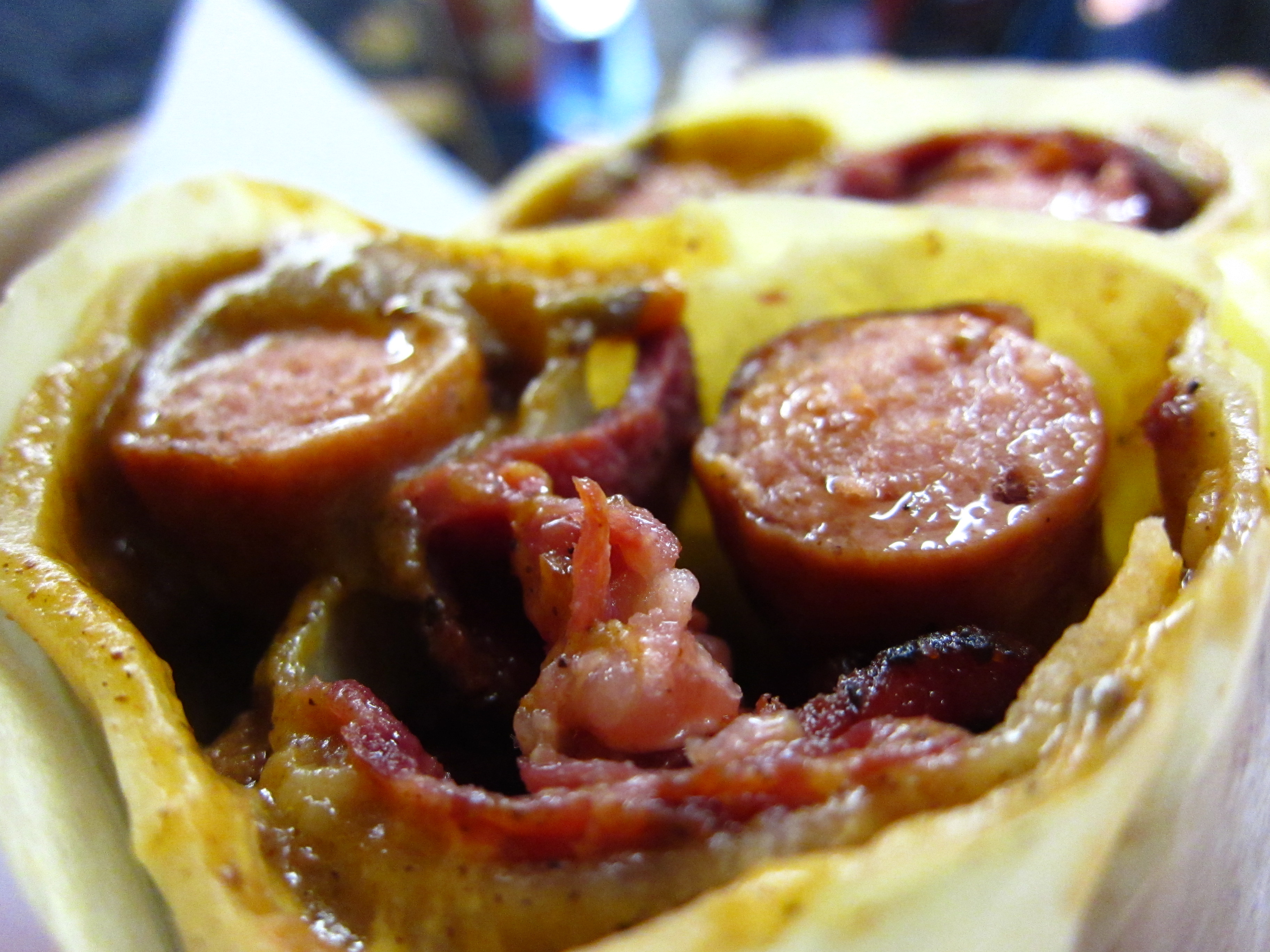 I ordered the bacon taro bread with polish sausage, topped with their secret garlic sauce and guava relish. From what I expected and what I actually got was very different. I was expecting a warm, chewy, doughy bread with hints of bacon and taro. The bread was very stale and pretty much broke. It had little flavor, and definitely no bacon or taro flavor. The sauces didn’t really help moisten everything. The hot dog sausage itself was very good. It have a nice beefy flavor and a good snap. It was juicy, and no too salty.