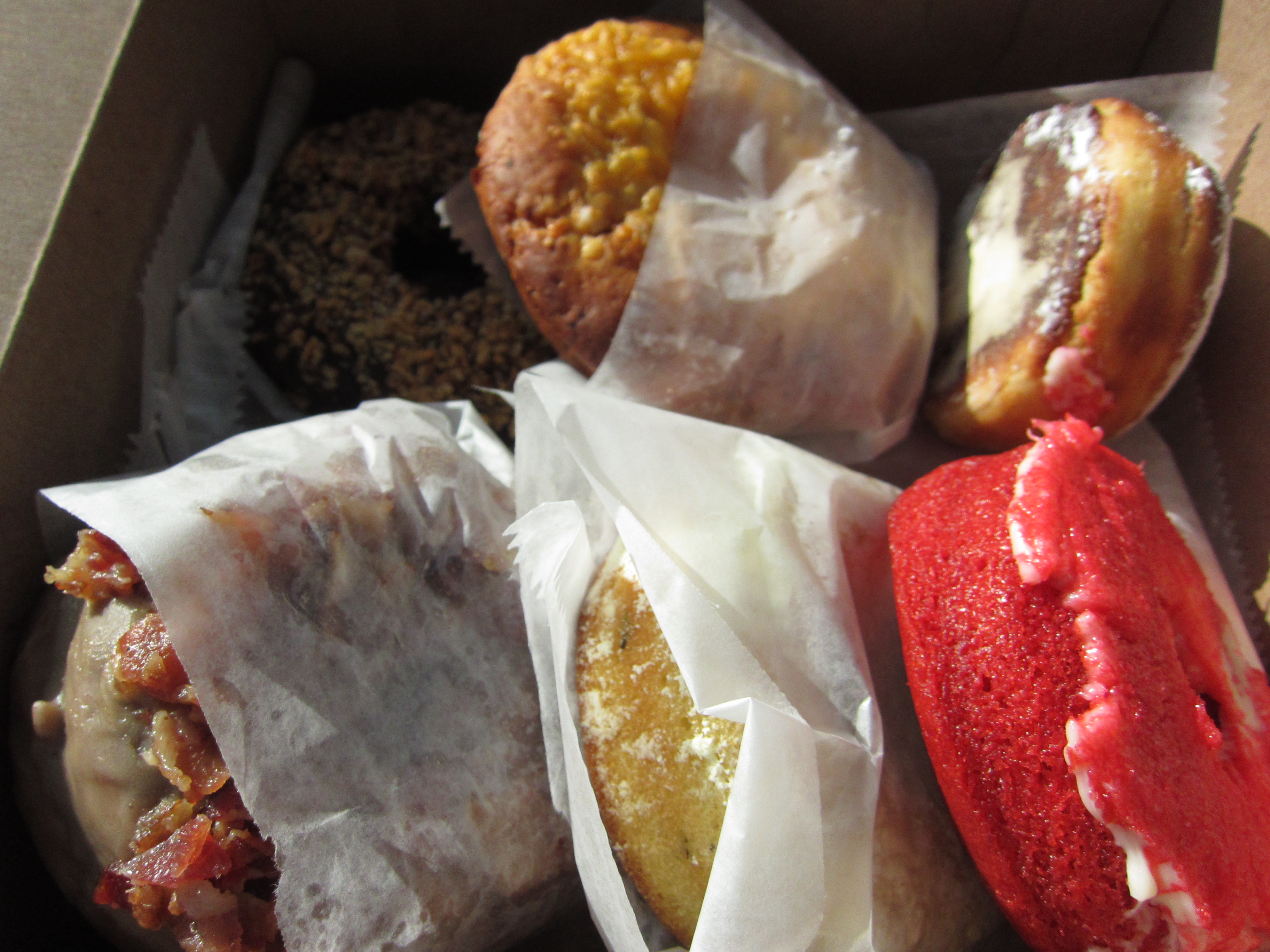 In this mix, you can see chocolate hazelnut (GF), maple bacon, rosemary olive oil, peanutbutter and jelly, chorizo cheddar, and red velvet. The chocolate hazelnut, for being gluten free was one of my favorites. Though it broke and fell apart in my hands, the hazelnut crumble was quite nice. The maple bacon to me had the most intense flavor. Topped with a lot of bacon, the sweet maple and salty bacon made a nice combo. The weird ones were the olive oil rosemary and chorizo cheddar. The olive oil rosemary was bland and bready — it might have well been rosemary bread. The chorizo cheddar was interesting — it had a nice spice with cheddar, but still more bread than, dare I say, “donut”. The peanutbutter and jelly was familiar and a good take on the fonut experience. And of course, you can’t go wrong with red velvet, though, you are better off getting the cupcake next door at Doughboys.